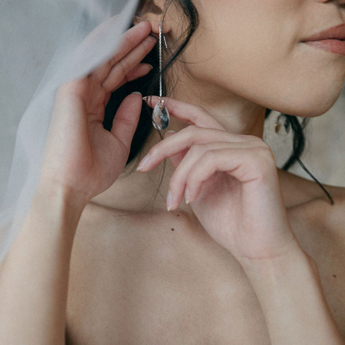 Simple and elegant bridal earrings. These gorgeous crystal teardrops delicately hang from sterling silver or gold filled ear threaders. Adjustable in length, you can thread the earring to make the drop longer or shorter. The perfect modern crystal earring.